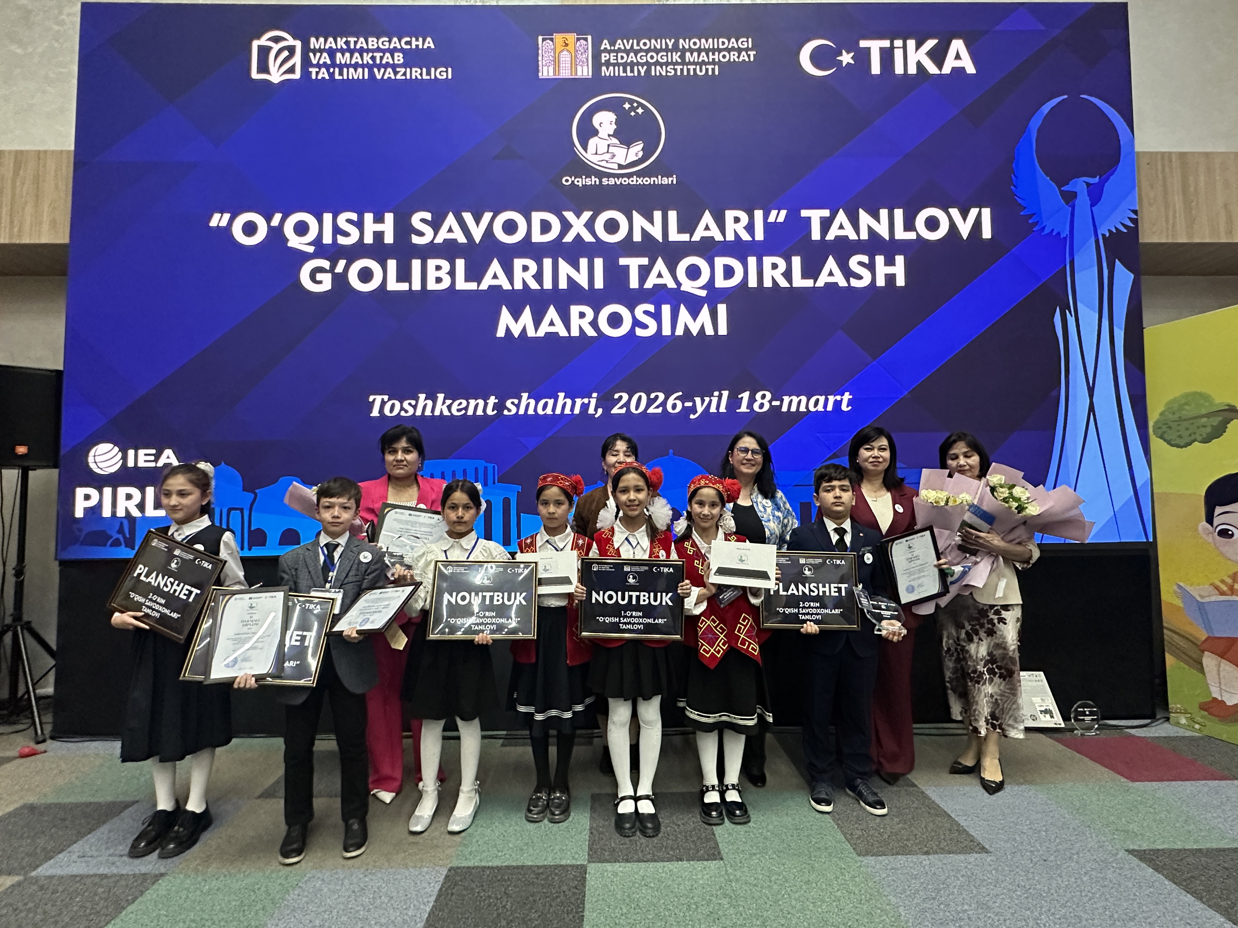 Öğrenciler, öğretmenler, okul müdürleri, veliler, Özbekistan Okul Öncesi ve Okul Eğitimi Bakanlığı, TİKA Taşkent Program Koordinatörlüğü ve Abdulla Avloniy Pedagojik Yeterlilik Ulusal Enstitüsünün katılımıyla Taşkent’te düzenlenen törenle öğrencilere ödülleri takdim edildi.  Kültürel gösterilerle renklenen ödül töreninde, Özbekistan’ın 14 bölgesinde dereceye giren 42 öğrenciye, dizüstü bilgisayarlar, tabletler, sertifikalar ve hatıra plaketleri takdim edildi.