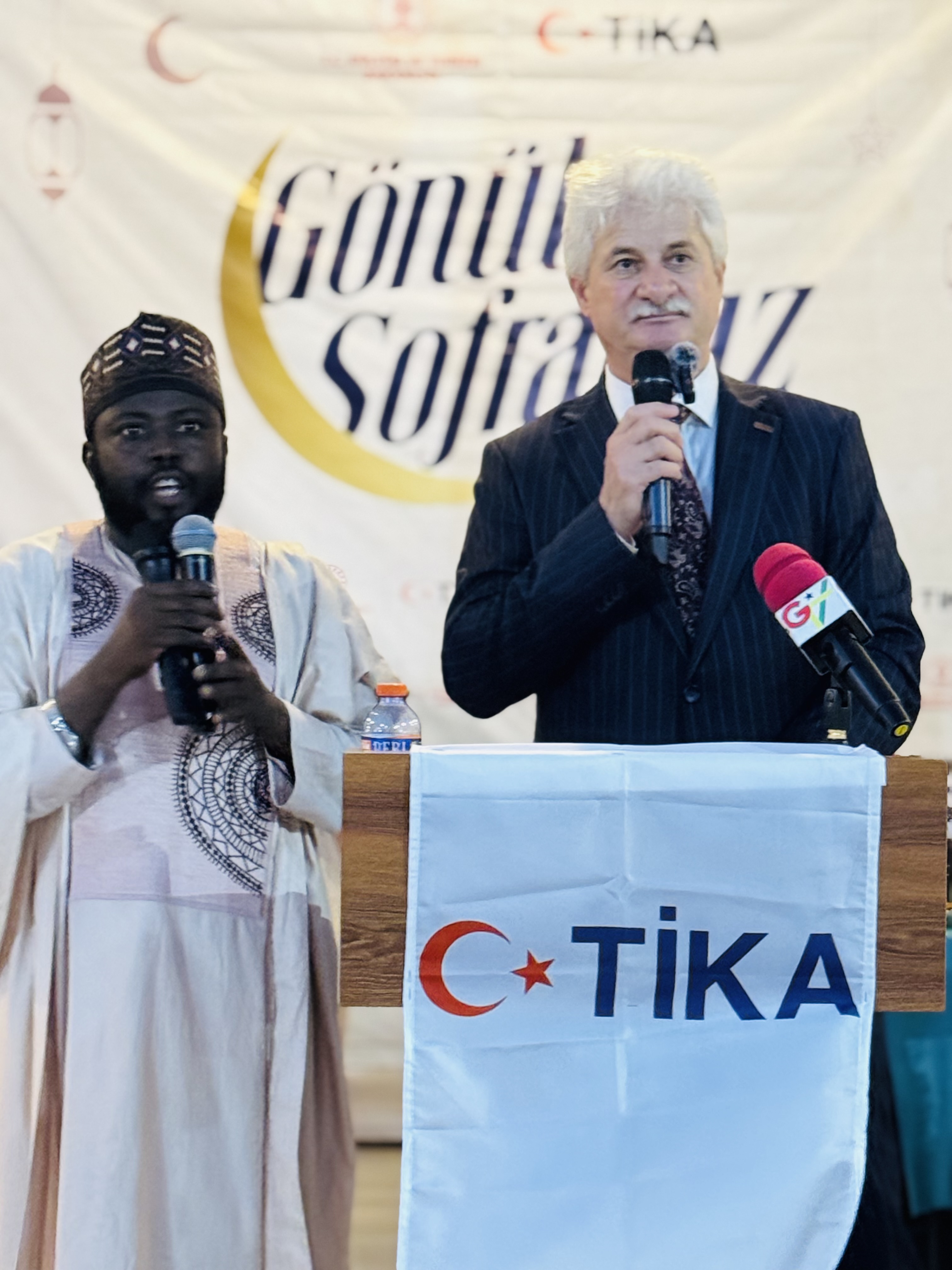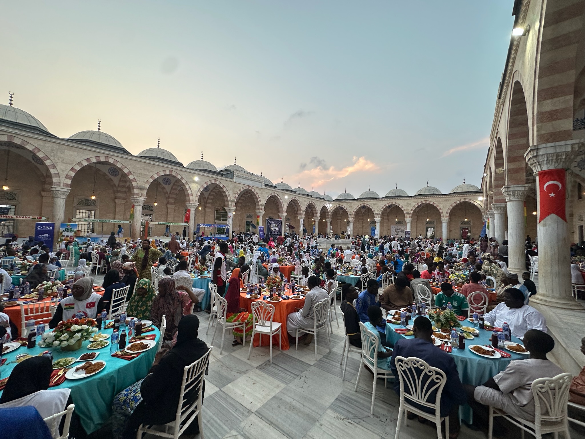 İftar programı, Türk hayırseverlerin desteğiyle inşa edilen Gana Milli Cami ve Külliyesi’nin avlusunda düzenlendi.